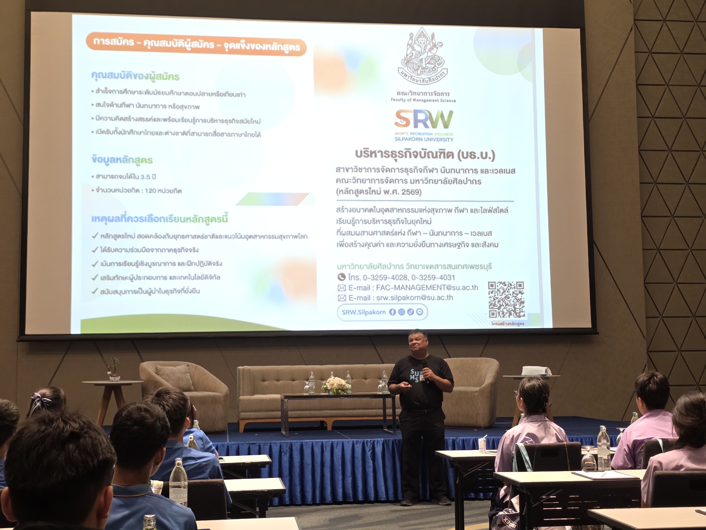 คณะวิทยาการจัดการ มหาวิทยาลัยศิลปากร เดินหน้าขับเคลื่อนวงการศึกษาด้านธุรกิจสุขภาพ เปิดตัวหลักสูตรใหม่ “บริหารธุรกิจบัณฑิต สาขาการจัดการธุรกิจกีฬา นันทนาการ และเวลเนส” อย่างเป็นทางการ ในงาน “เปิดโลกธุรกิจกีฬา นันทนาการและเวลเนส (Inspire & Innovate: SRW Journey)” โดยมี ผศ.ดร.ณัฎฐนา ลีฬหรัตนรักษ์ รองคณบดีฝ่ายจัดการศึกษา เป็นประธานเปิดงาน จัดขึ้นเมื่อวันที่ 14 พฤศจิกายน 2568 ณ โรงแรมฮอลิเดย์ อินน์ วานา นาวา หัวหิน อำเภอหัวหิน จังหวัดประจวบคีรีขันธ์