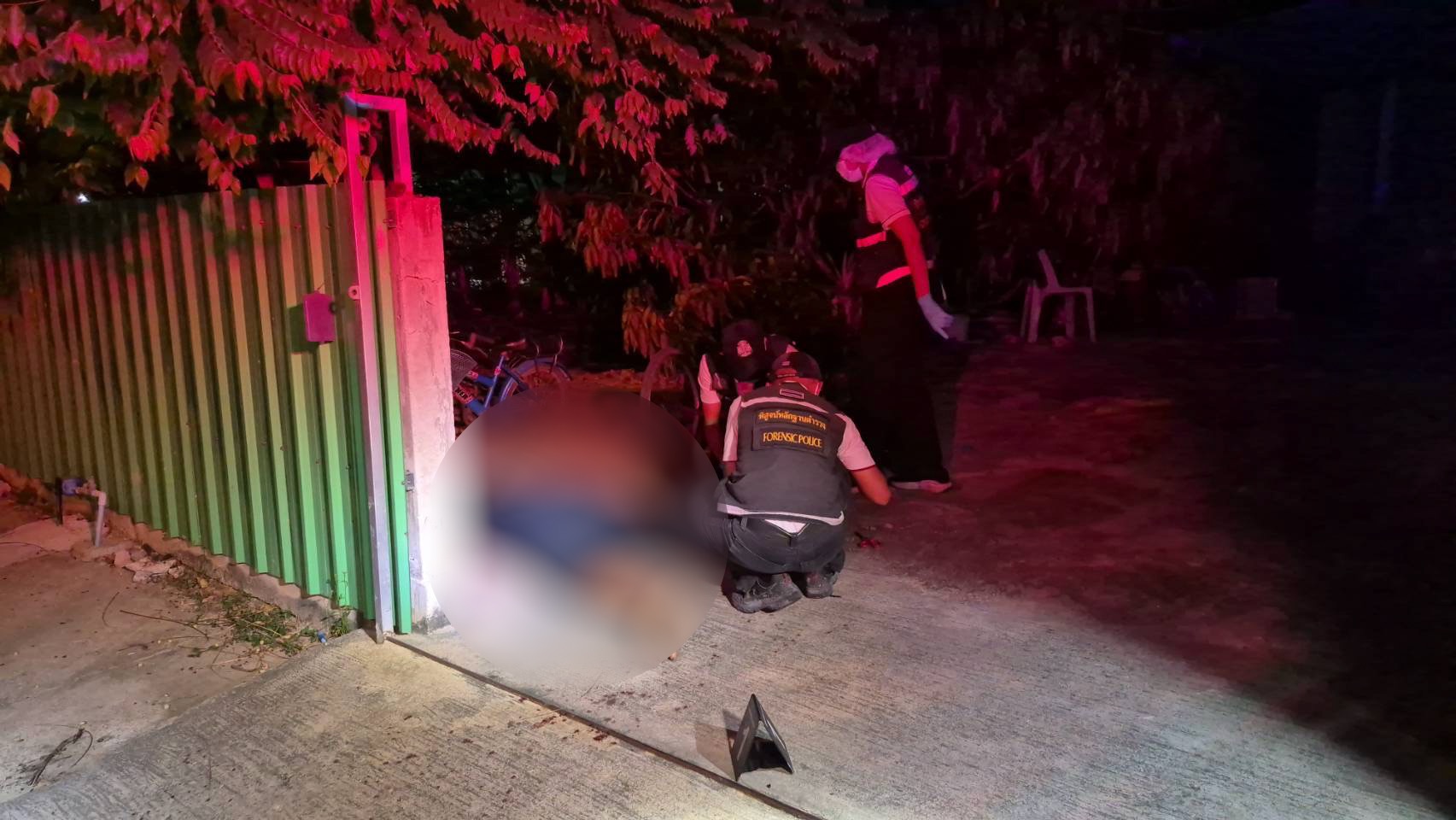 ที่เกิดเหตุบริเวณถนนหน้าบ้าน พบศพชาย 1 ราย ทราบชื่อคือ นายอรุณ (ขอสงวนนามสกุล) อายุ 42 ปี นอนคว่ำหน้าอยู่บริเวณประตูรั้วหน้าบ้าน สภาพถูกยิงด้วยอาวุธปืนลูกโม่ขนาด .38 หลายนัด นอนจมกองเลือด ใกล้กันพบหัวกระสุนปืนและคราบเลือดตกอยู่บนพื้น