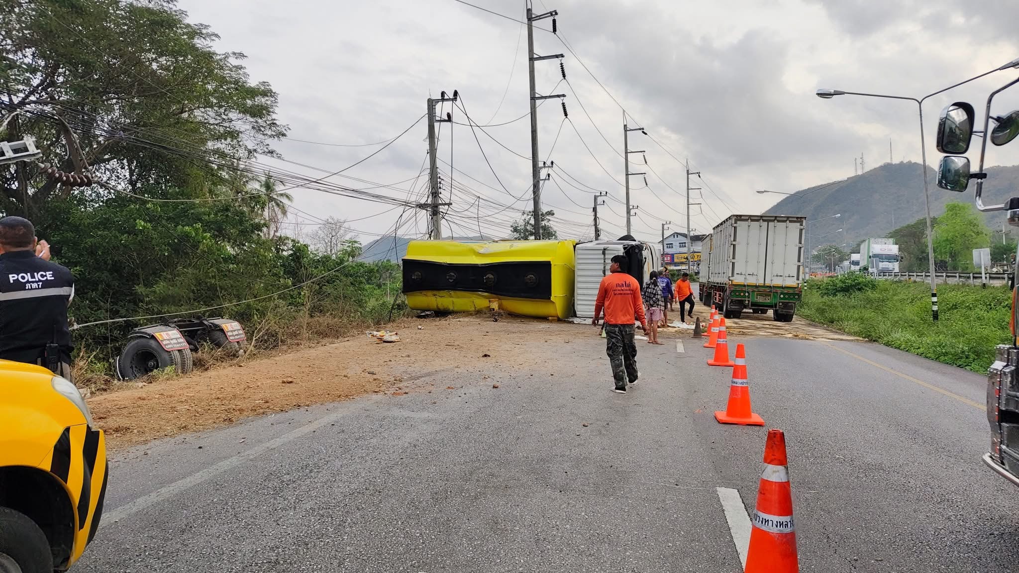 เบื้องต้นพบว่าเสาไฟฟ้าหักจำนวน 2 ต้น และมีน้ำมันปาล์มรั่วไหลบนพื้นผิวการจราจร ส่งผลให้การสัญจรต้องใช้ได้เพียง 1 ช่องทาง ทำให้เกิดการจราจรติดขัดเป็นจำนวนมาก