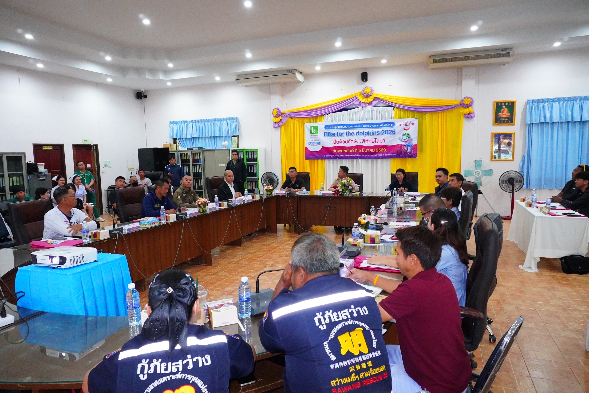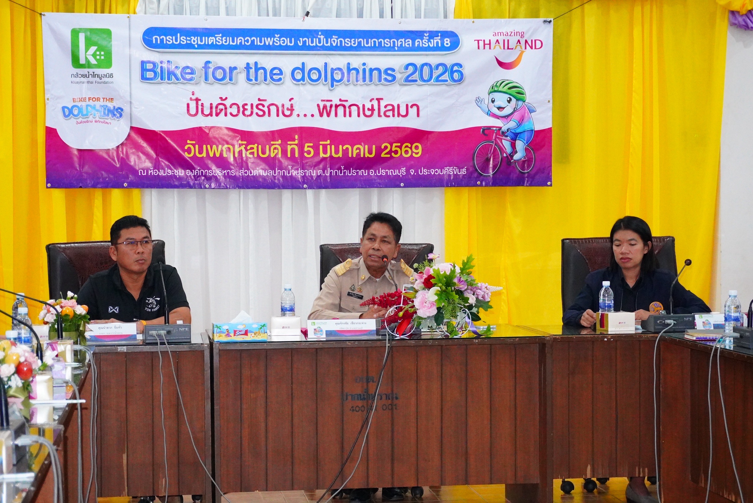 โดยที่ห้องประชุมองค์การบริหารส่วนตำบลปากน้ำปราณ อำเภอปราณบุรี จังหวัดประจวบคีรีขันธ์ นายจักรชัย เขียวกระจ่าง ปลัดอาวุโสอำเภอปราณบุรี เป็นประธานการประชุมเตรียมความพร้อมโครงการปั่นจักรยานการกุศล “Bike for the Dolphins 2026 ปั่นด้วยรักษ์ พิทักษ์โลมา” โดยมี นายศรัณยู ชเนศร์ รองกรรมการบริหารกลุ่มบริษัทโรงพยาบาลกล้วยน้ำไทและกล้วยน้ำไทมูลนิธิ นางสาวเกศินี แก้วกัณฑ์ ปลัดอำเภอหัวหน้ากลุ่มงานบริหารงานปกครอง รักษาราชการแทนนายอำเภอสามร้อยยอด นายนำลาภ อิ่มทั่ว นายกองค์การบริหารส่วนตำบลปากน้ำปราณ พ.ต.ท.อนัญญ์ สงวนสุด รอง ผกก.ป.สภ.สามร้อยยอด พ.ต.ท.กิตติ์นเรศ อารักษ์รุ่งพงศ์ รอง ผกก.ป.สภ.ปากน้ำปราณ นายบูรพา โอภาสประไพ บริษัท 168 อีเว้นท์ พร้อมด้วยทีมกู้ภัยมูลนิธิสว่างแผ่ไพศาลธรรมสถานปราณบุรี ทีมกู้ภัยมูลนิธิสว่างเมธีธรรมสถานสามร้อยยอด คณะจัดงานเมืองไทยไตรกีฬา บริษัทเมืองไทยประกันชีวิต จำกัด (มหาชน) และผู้แทนหน่วยงานที่เกี่ยวข้องเข้าร่วมประชุมอย่างพร้อมเพรียง